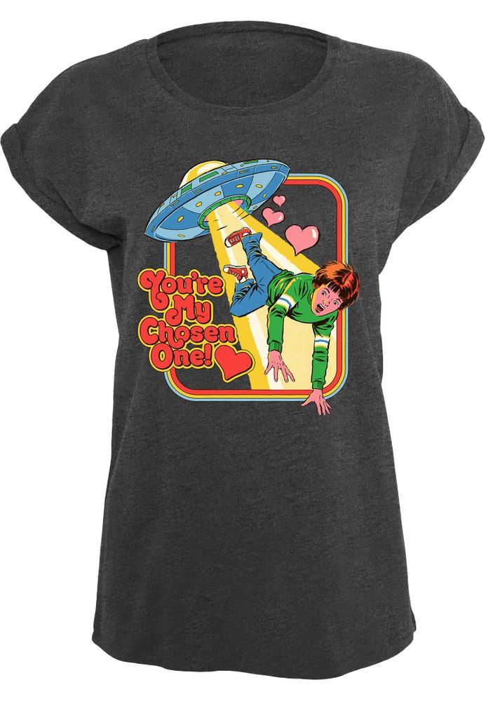 Das Girlshirt zeigt einen Jungen, der von einem UFO eingezogen wird. Dazu sieht man Herzen und den Satz "You’re My Chosen One!".