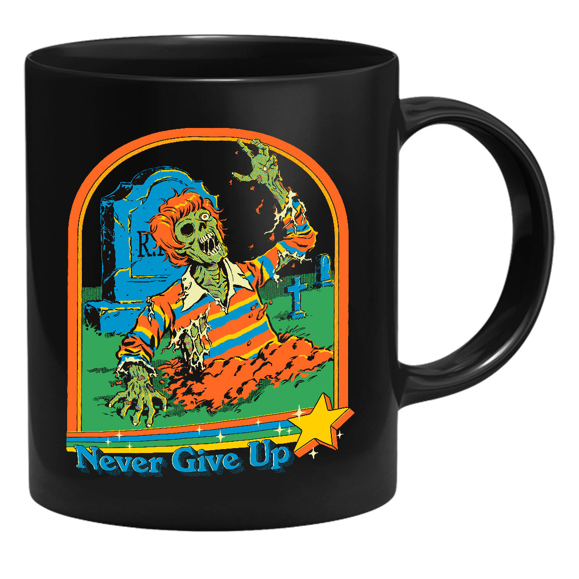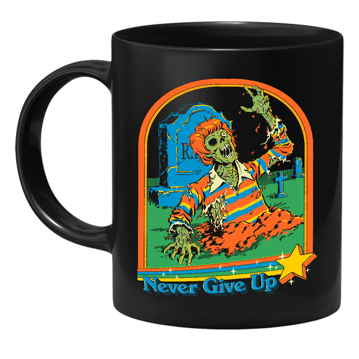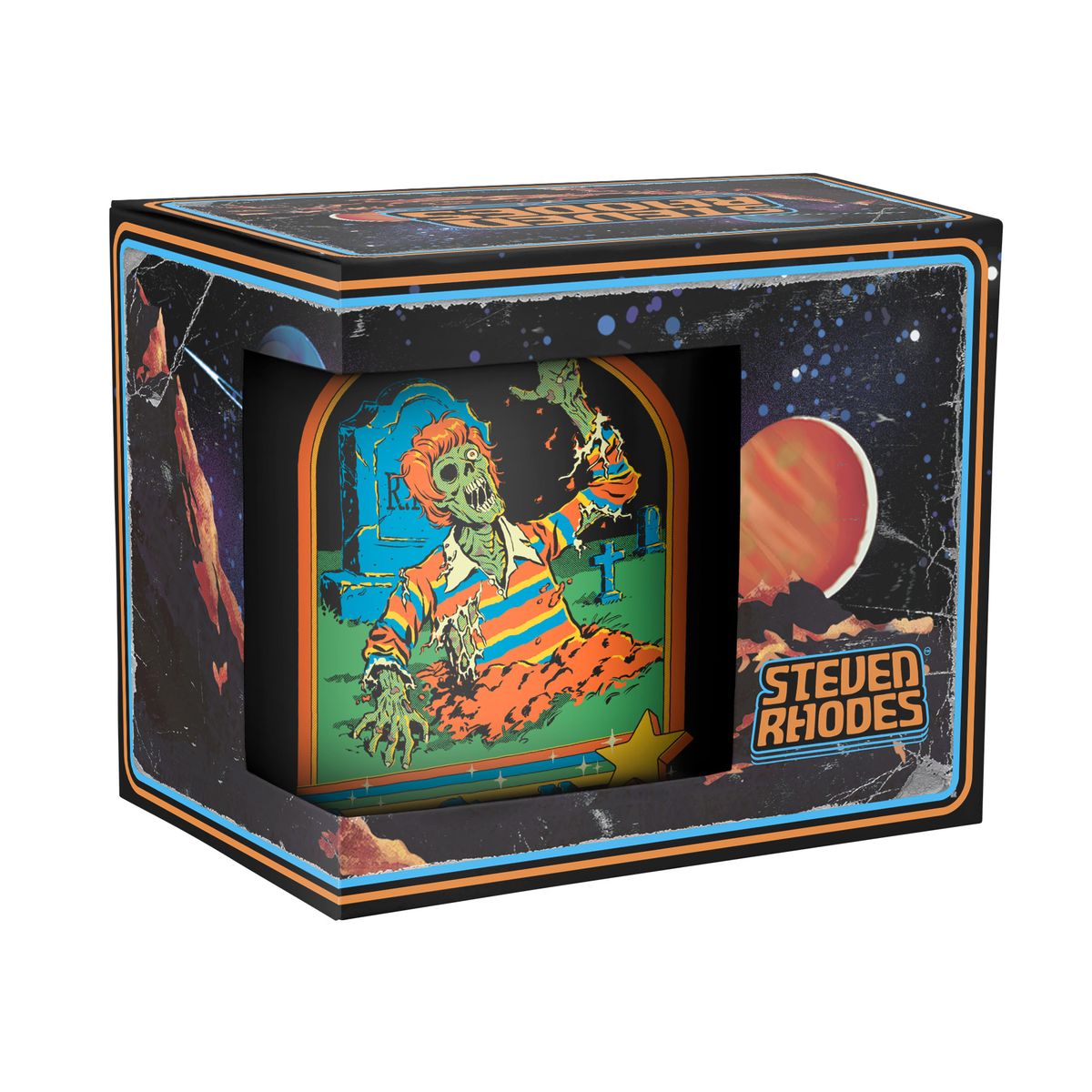 Die Tasse zeigt einen Zombie, der aus einem Grab kommt.