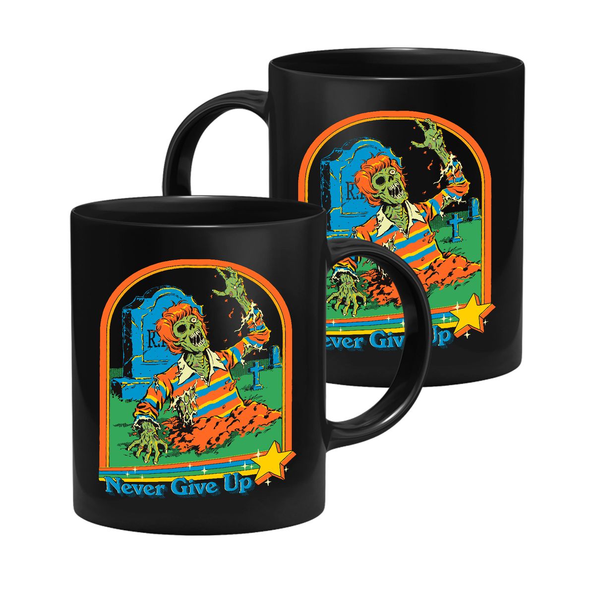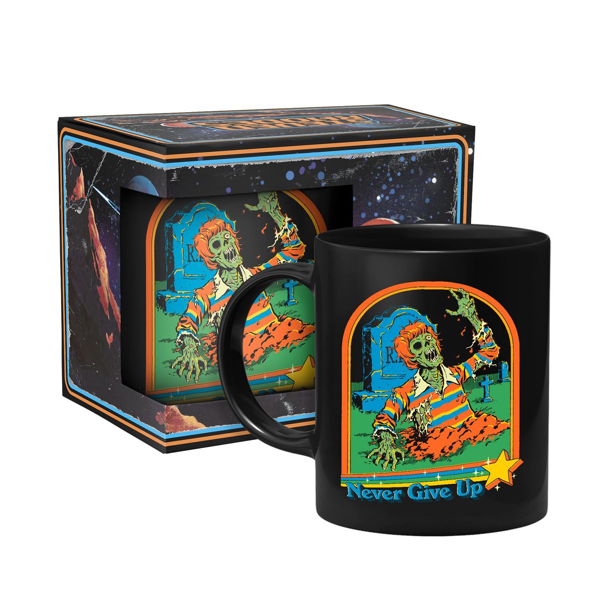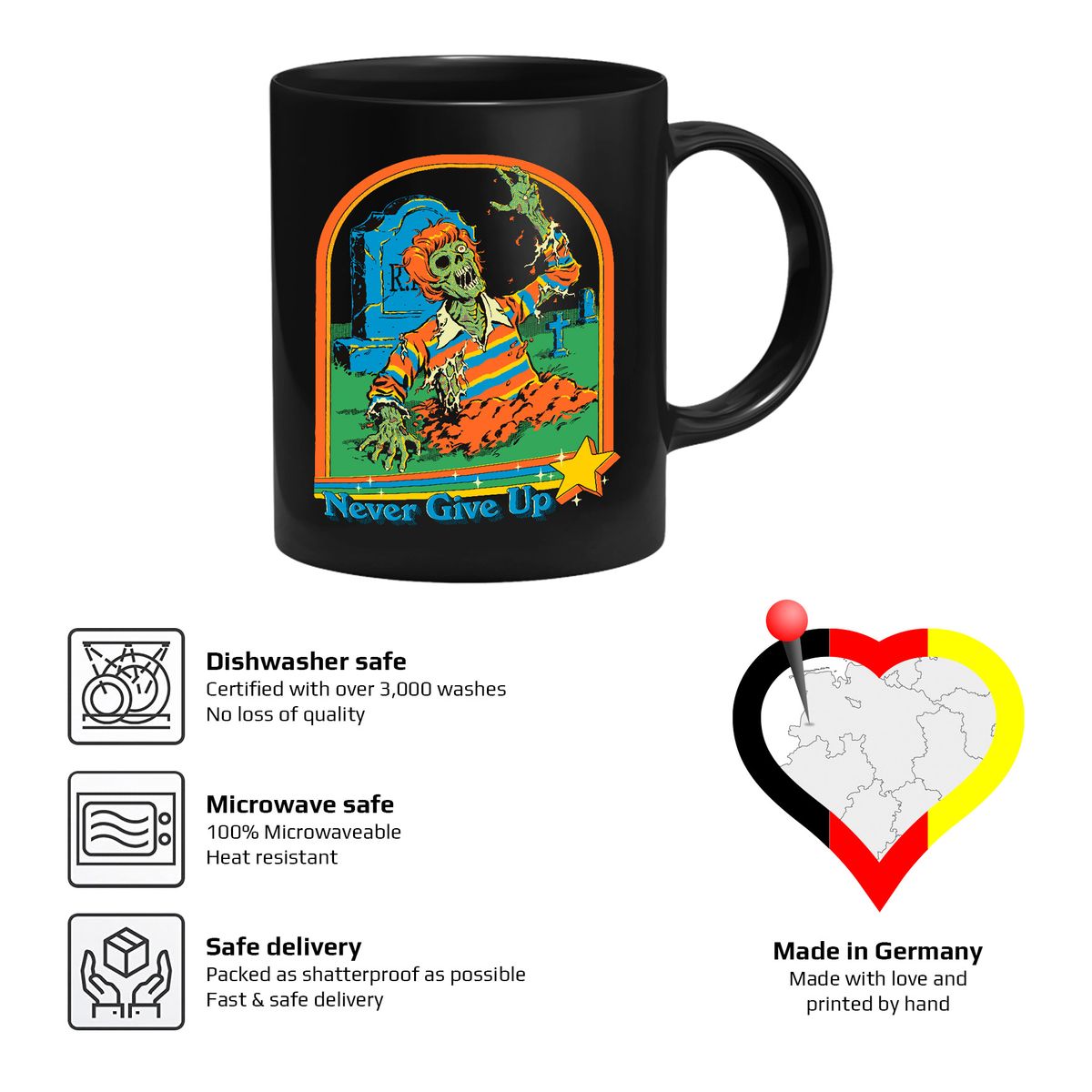Die Tasse zeigt einen Zombie, der aus einem Grab kommt.