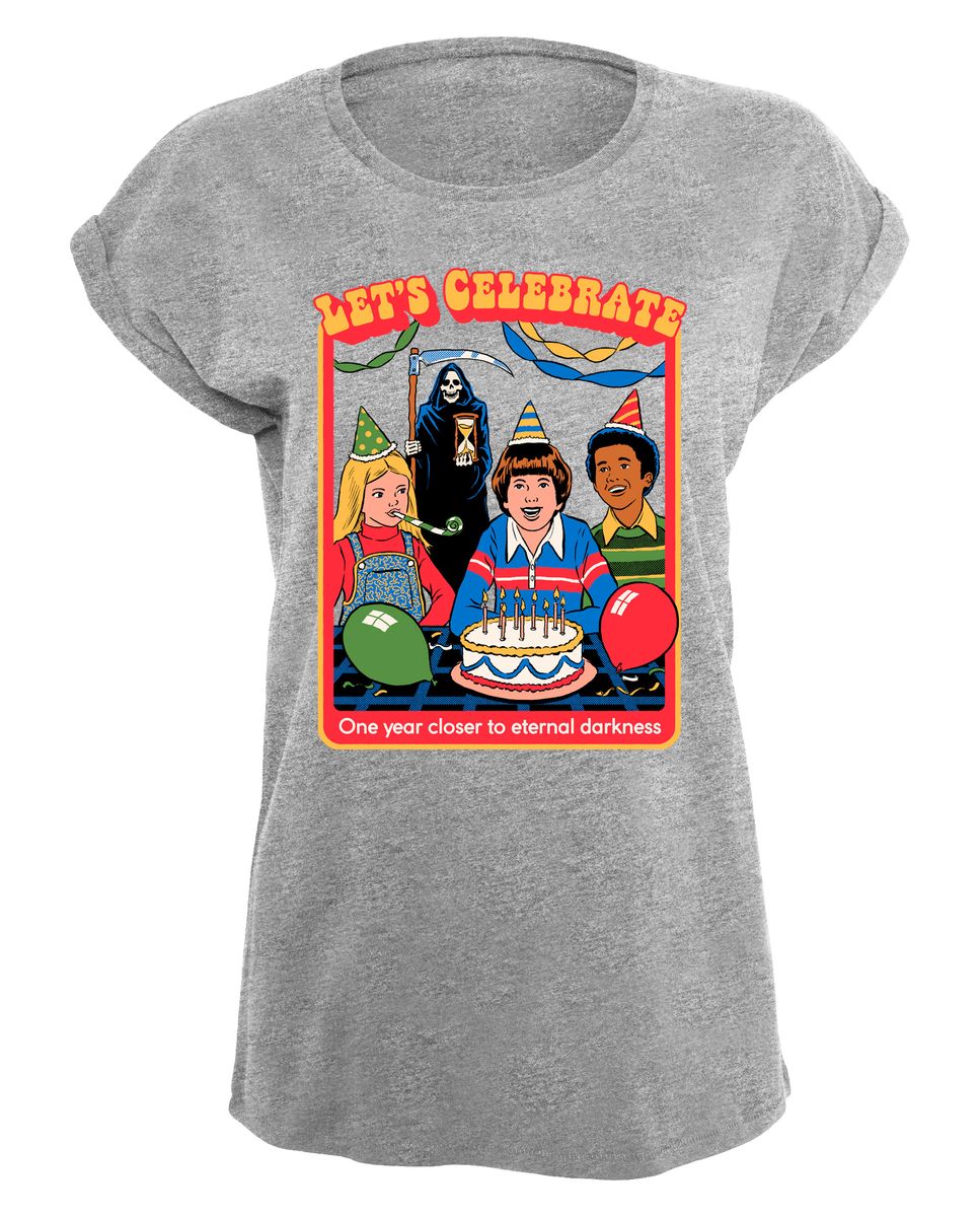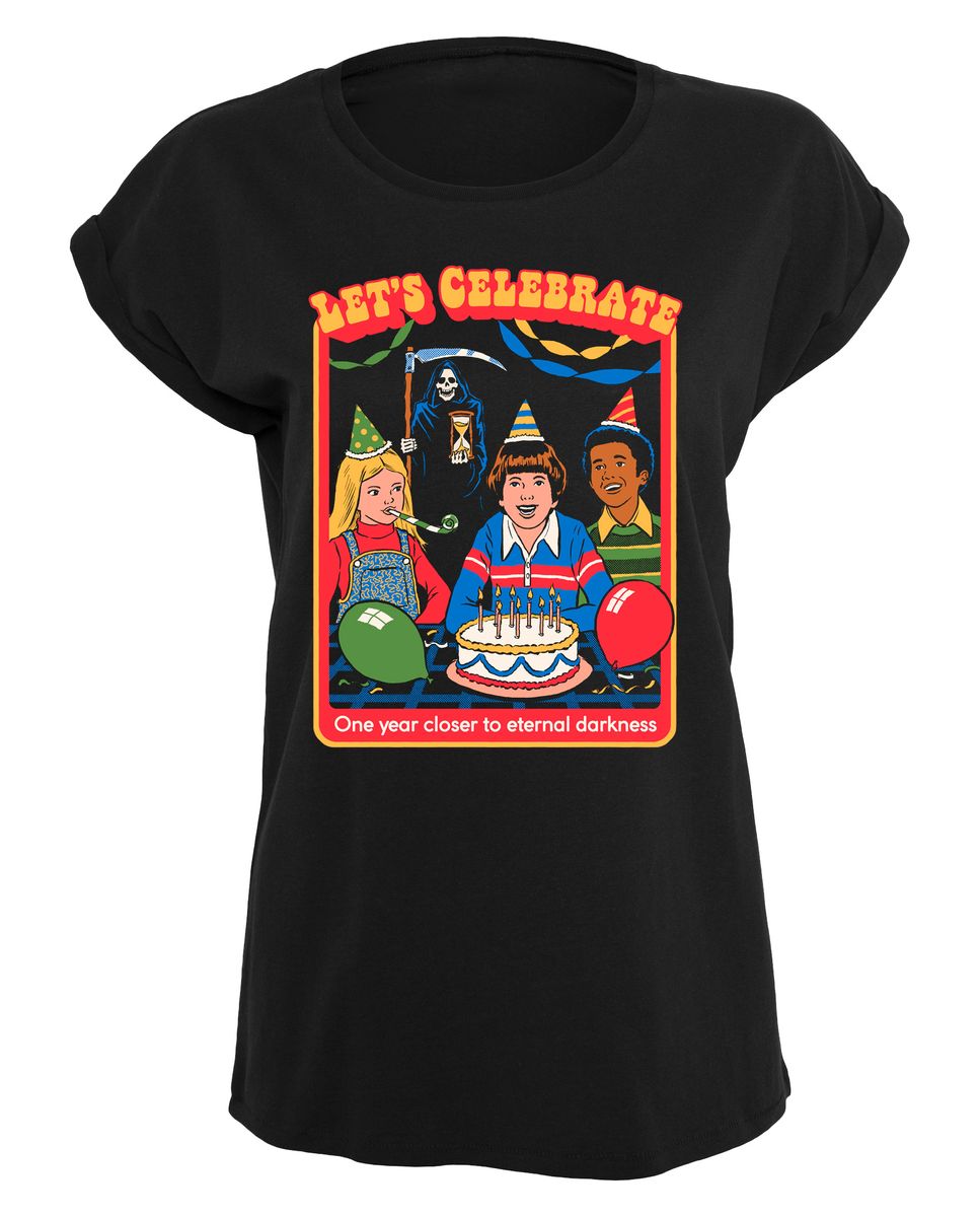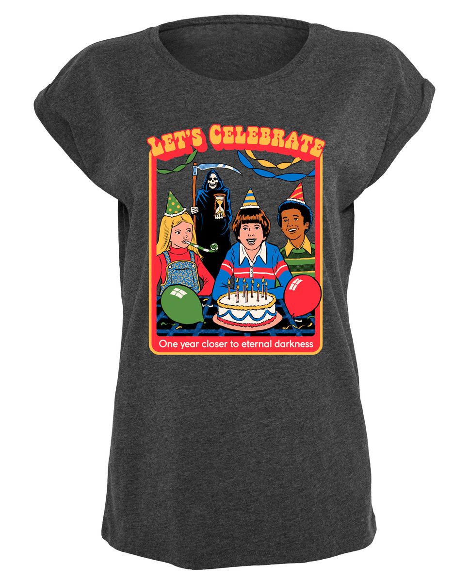 Das T-Shirt zeigt drei Kinder, die eine Party feiern. Im Hintergrund steht der Sensenmann mit einer Sanduhr.
