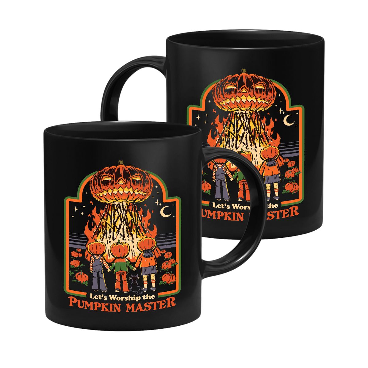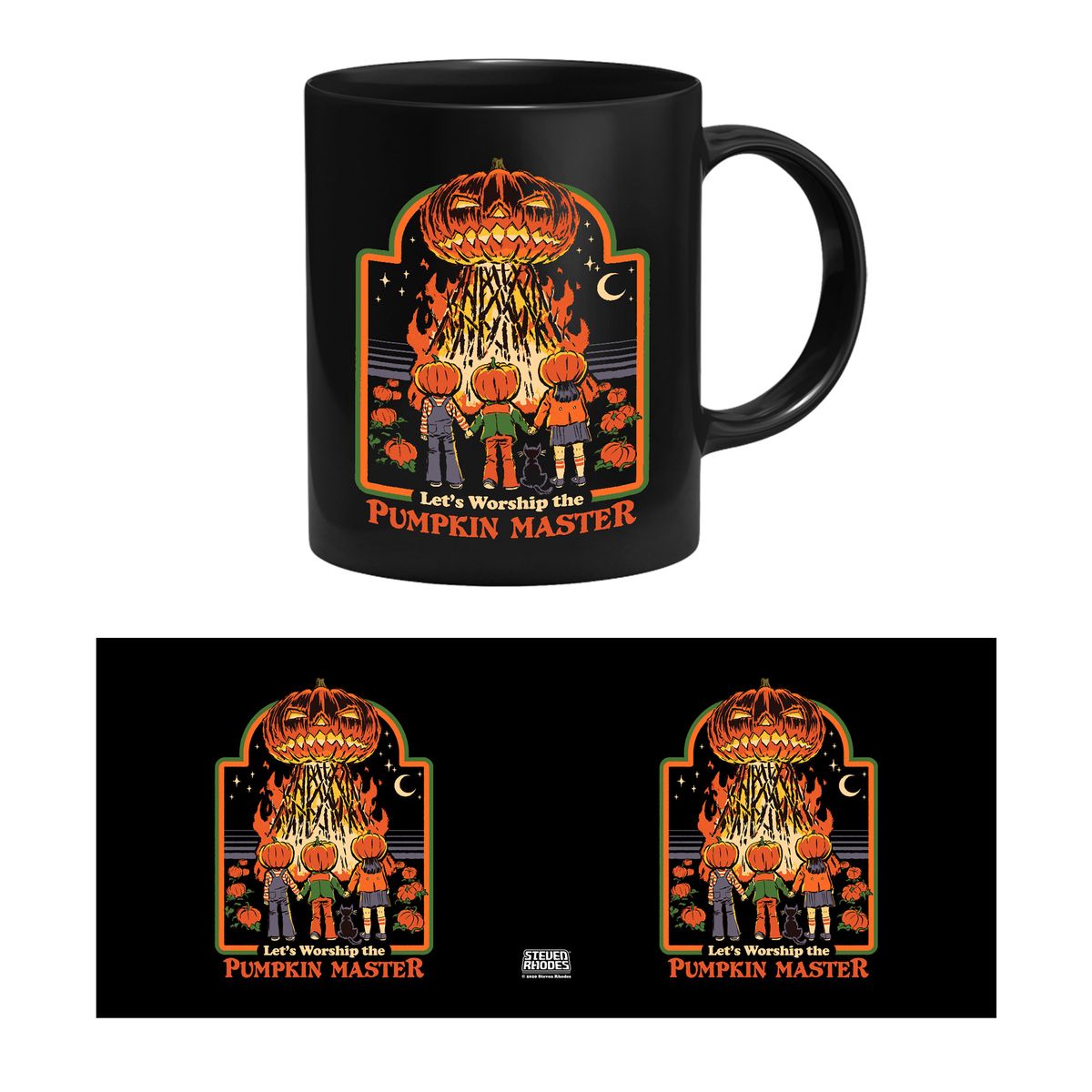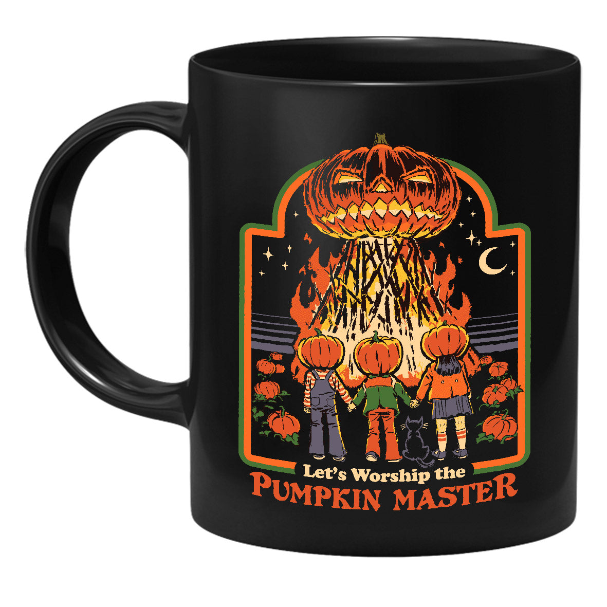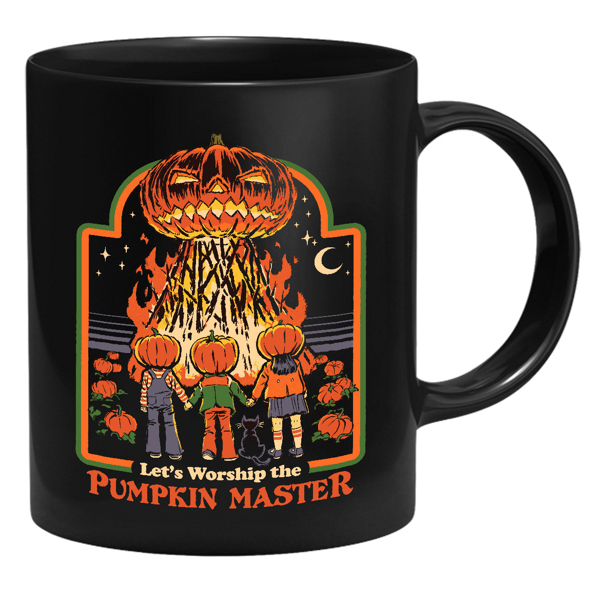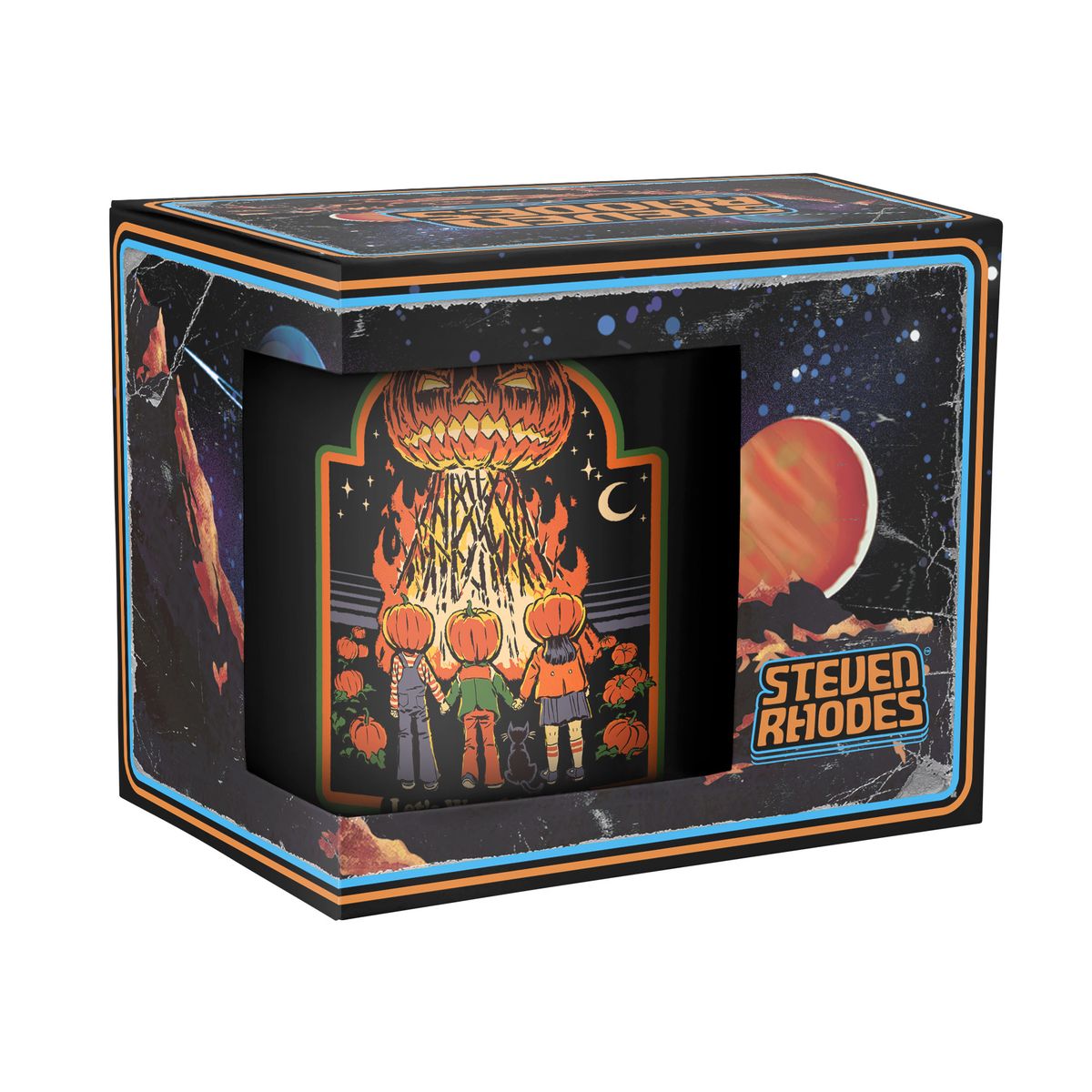 Die Tasse zeigt drei Kinder, die vor einem Kürbis-Feuer stehen.