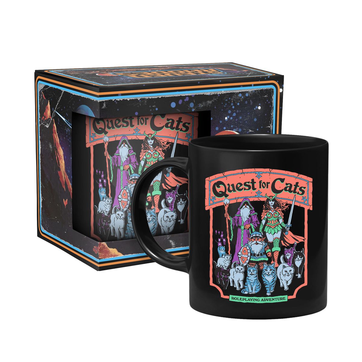 Die Tasse zeigt eine Gruppe Abenteurer mit einem Rudel Katzen.
