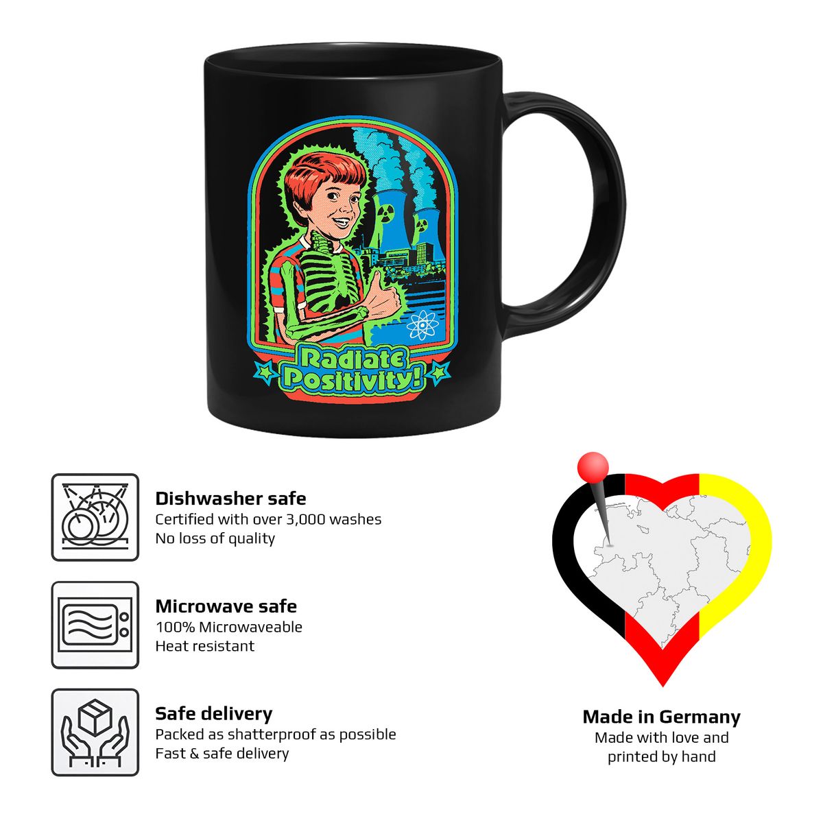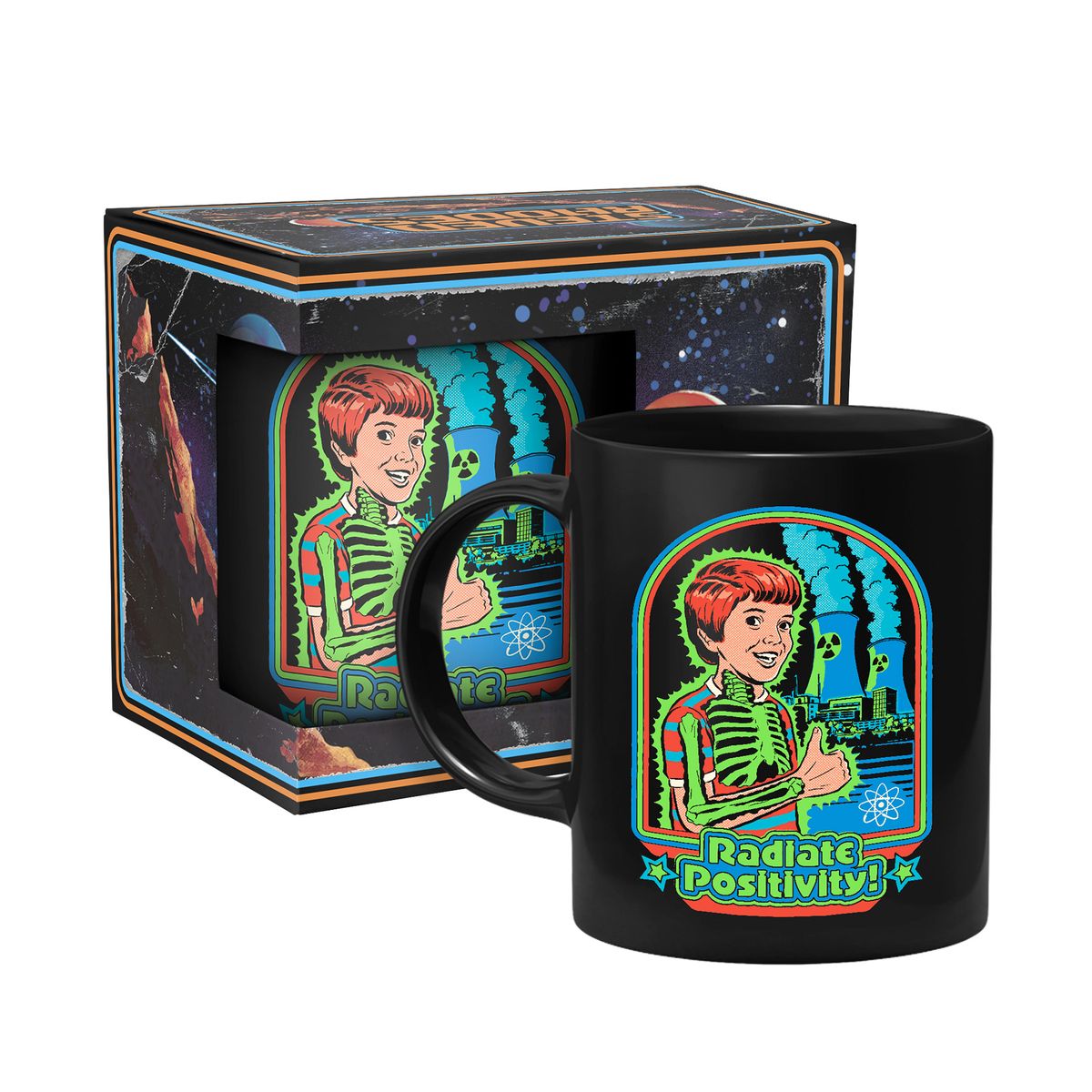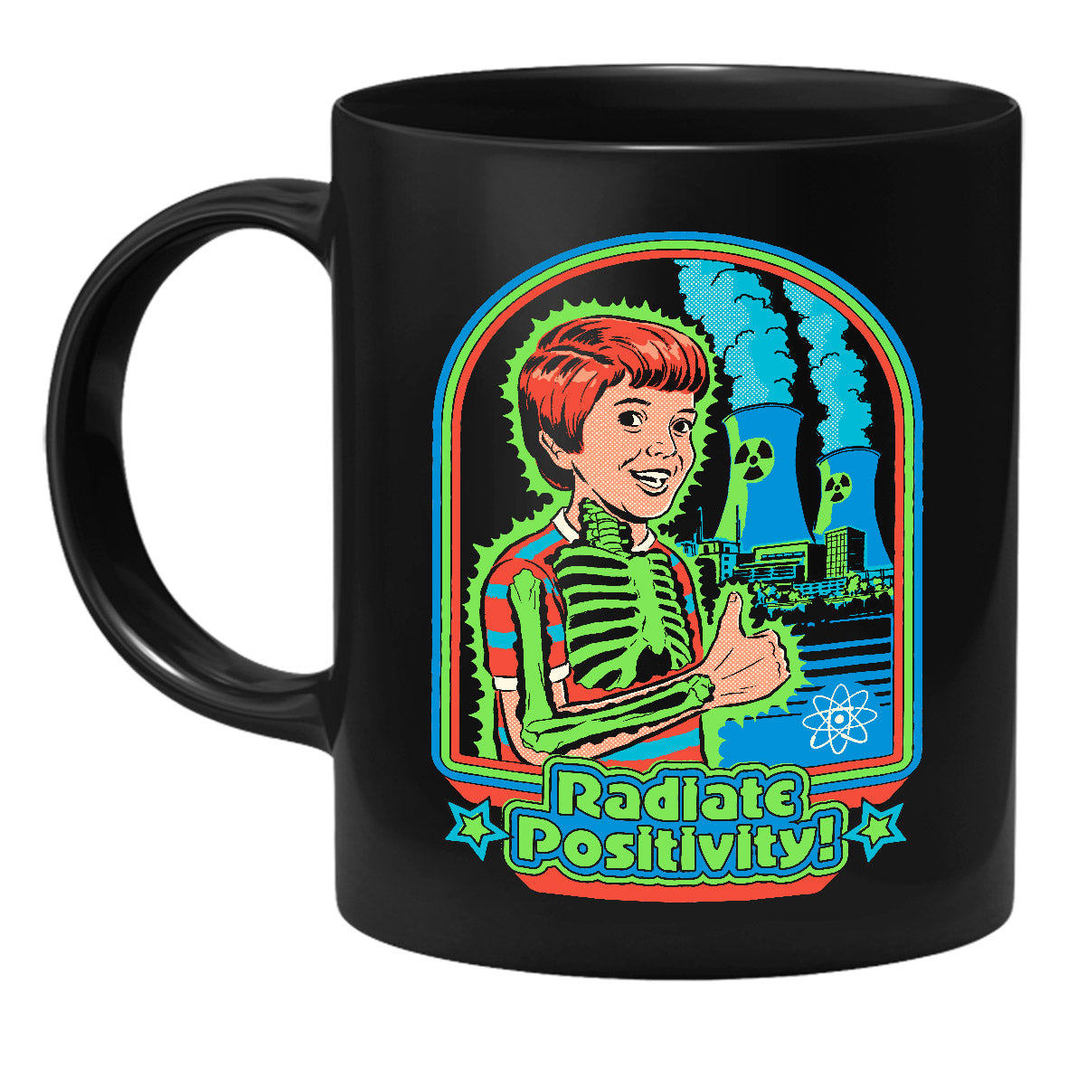 Die Tasse zeigt einen strahlenden Jungen vor einem Atomkraftwerk.