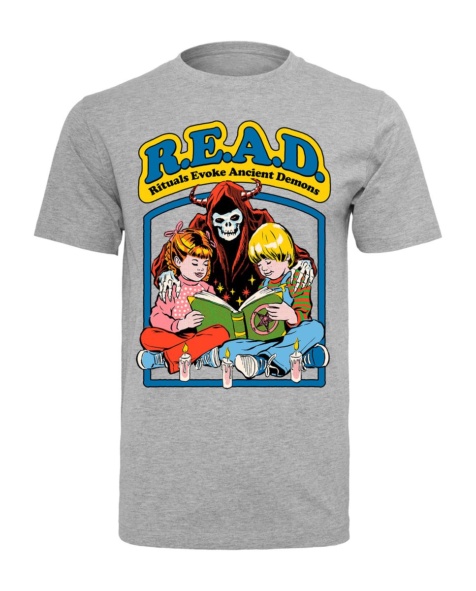 Das T-Shirt zeigt einen Dämon, der zwei Kindern etwas vorliest.