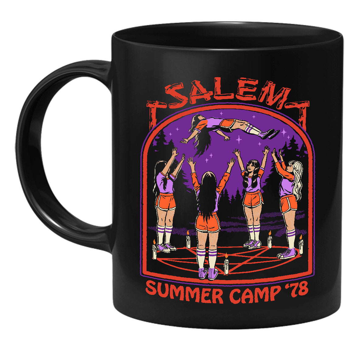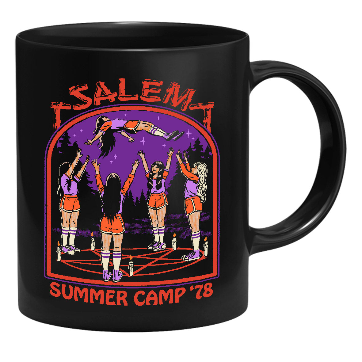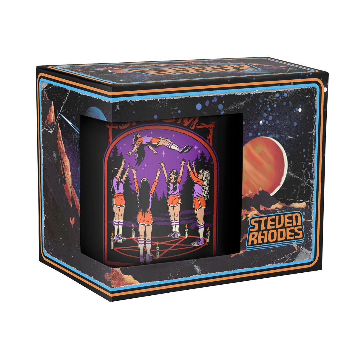 Die Tasse zeigt vier Mädchen in einem Pentagram, die ein fünftes Mädchen schweben lassen.