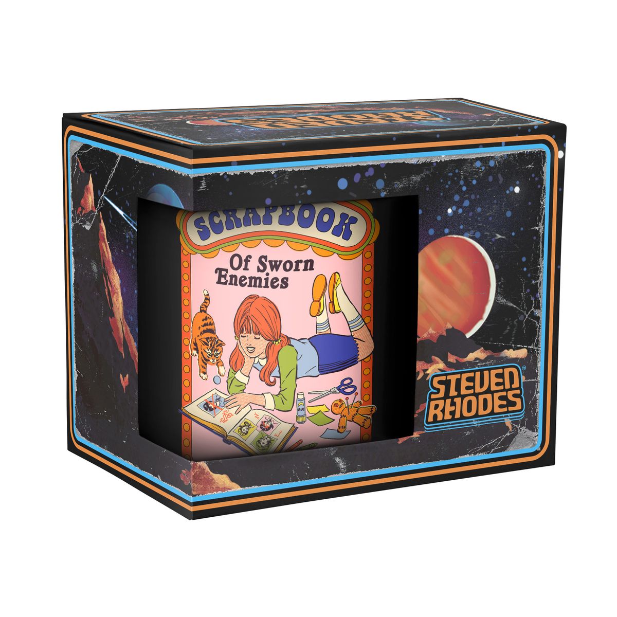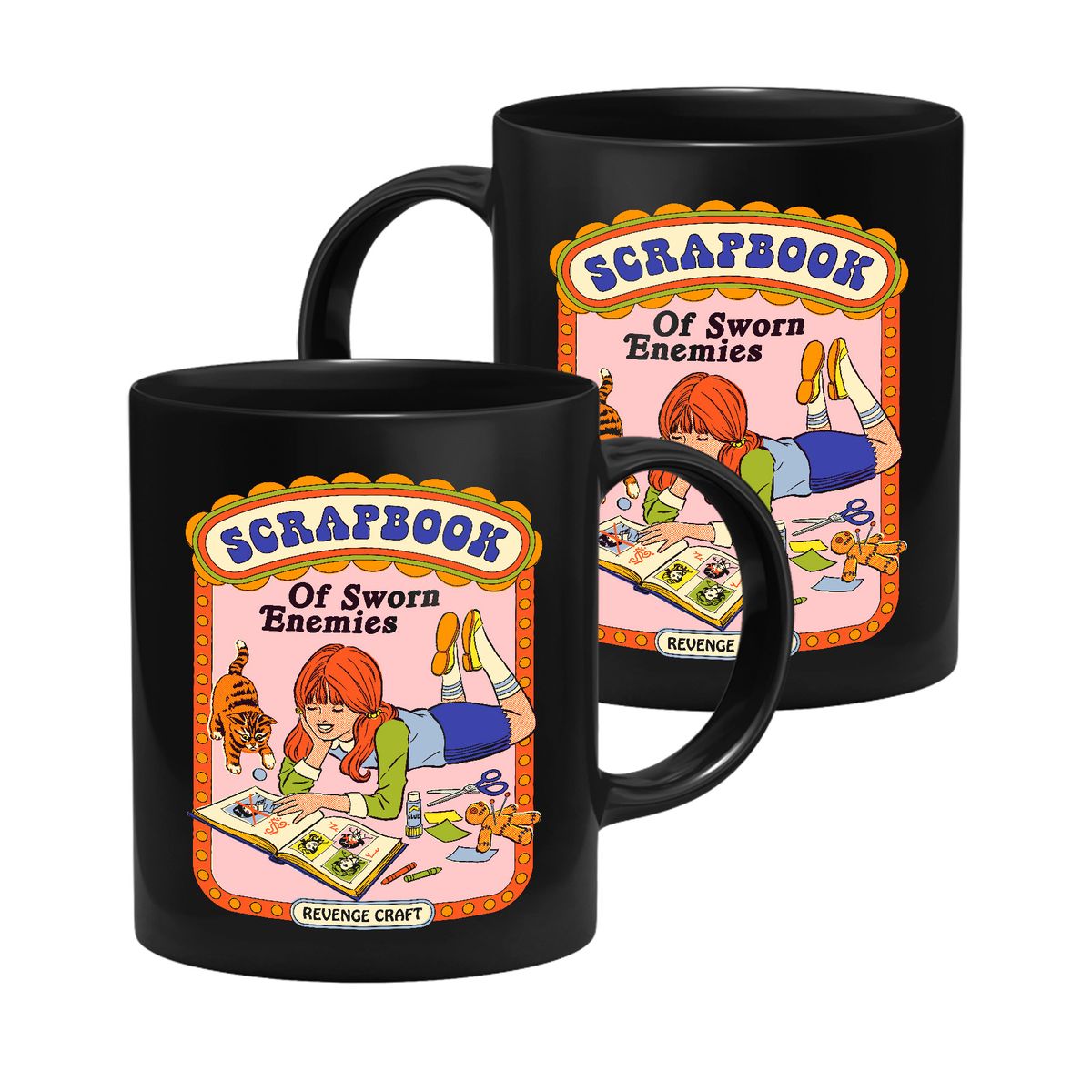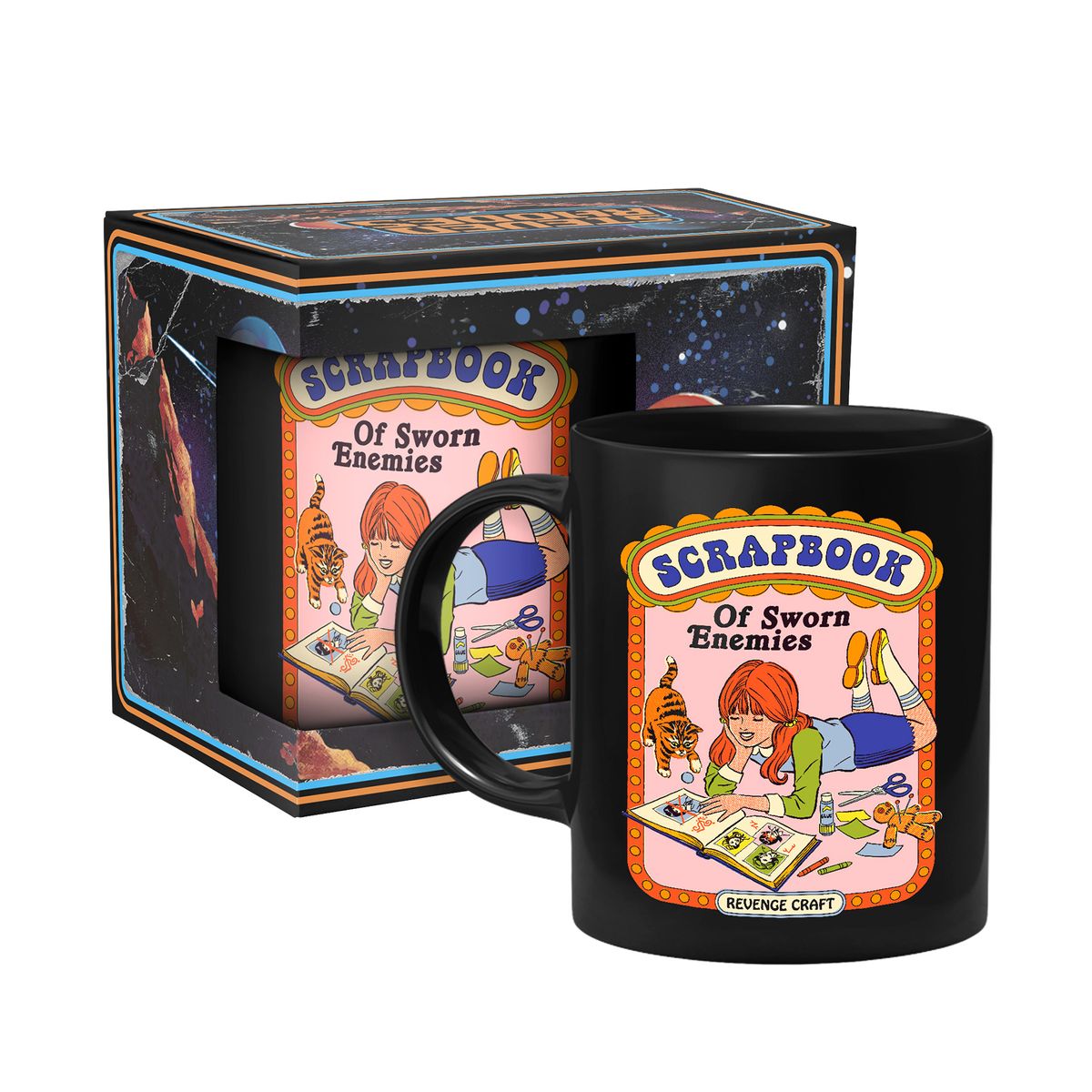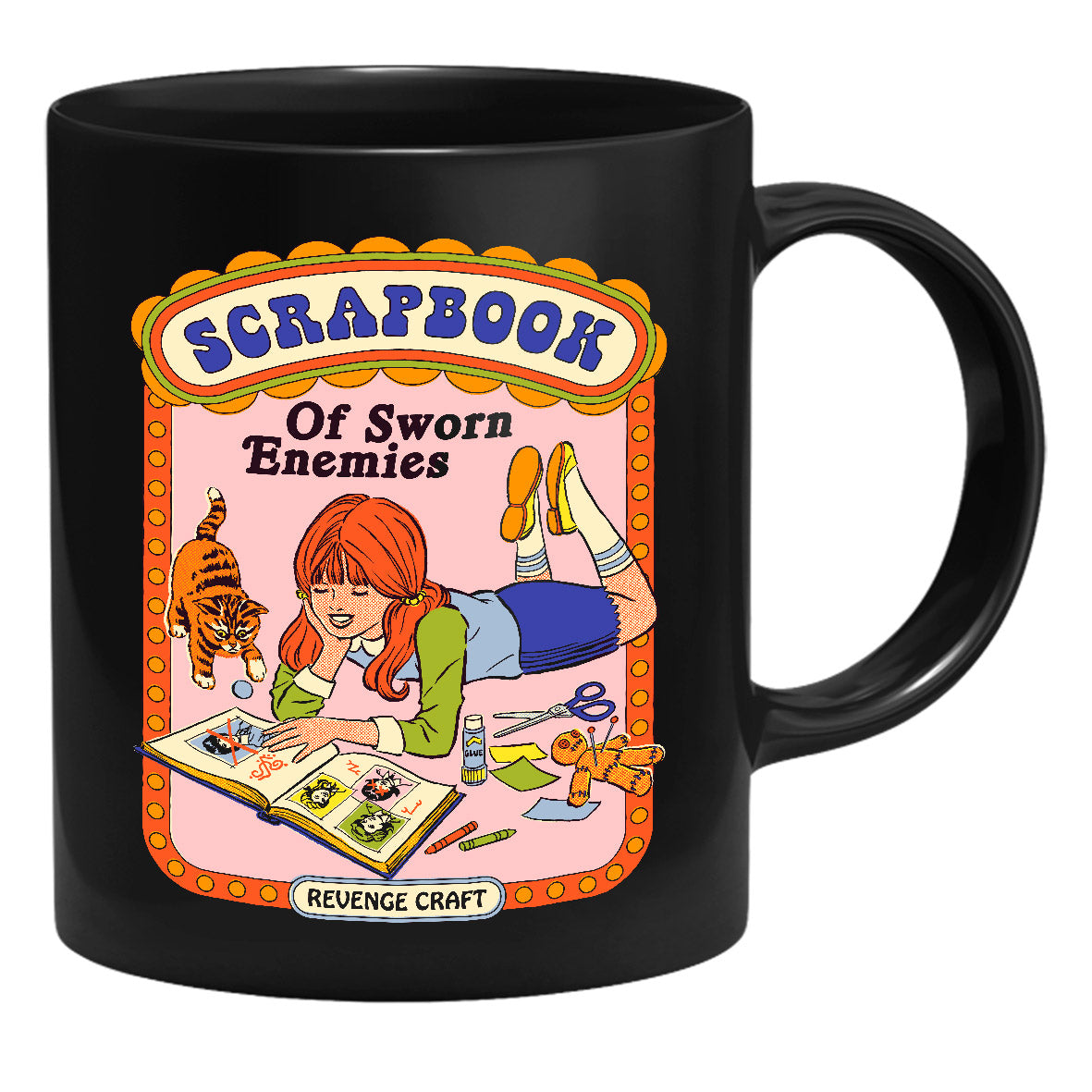 Die Tasse zeigt ein Mädchen, das in ihrem Feindebuch blättert.