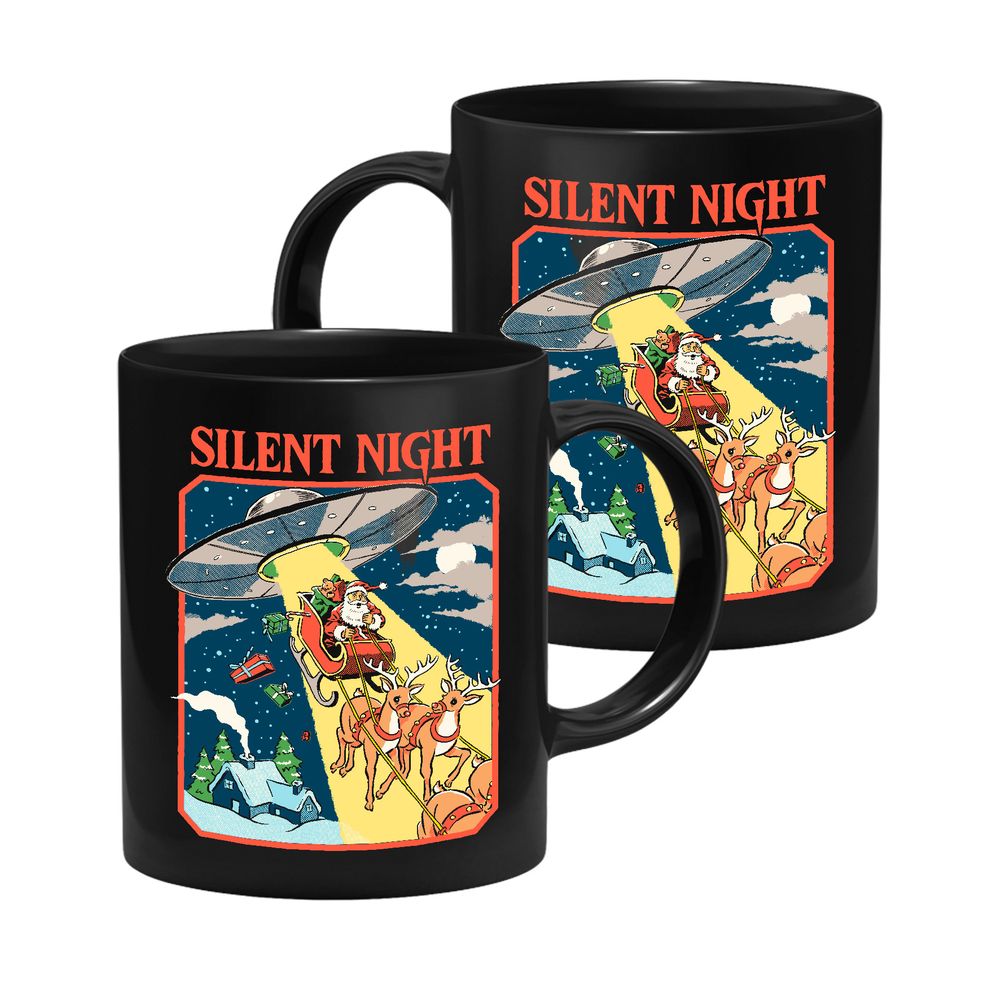 Die Tasse zeigt den Weihnachtsmann, der mit seinem Schlitten von einem Ufo entführt wird.