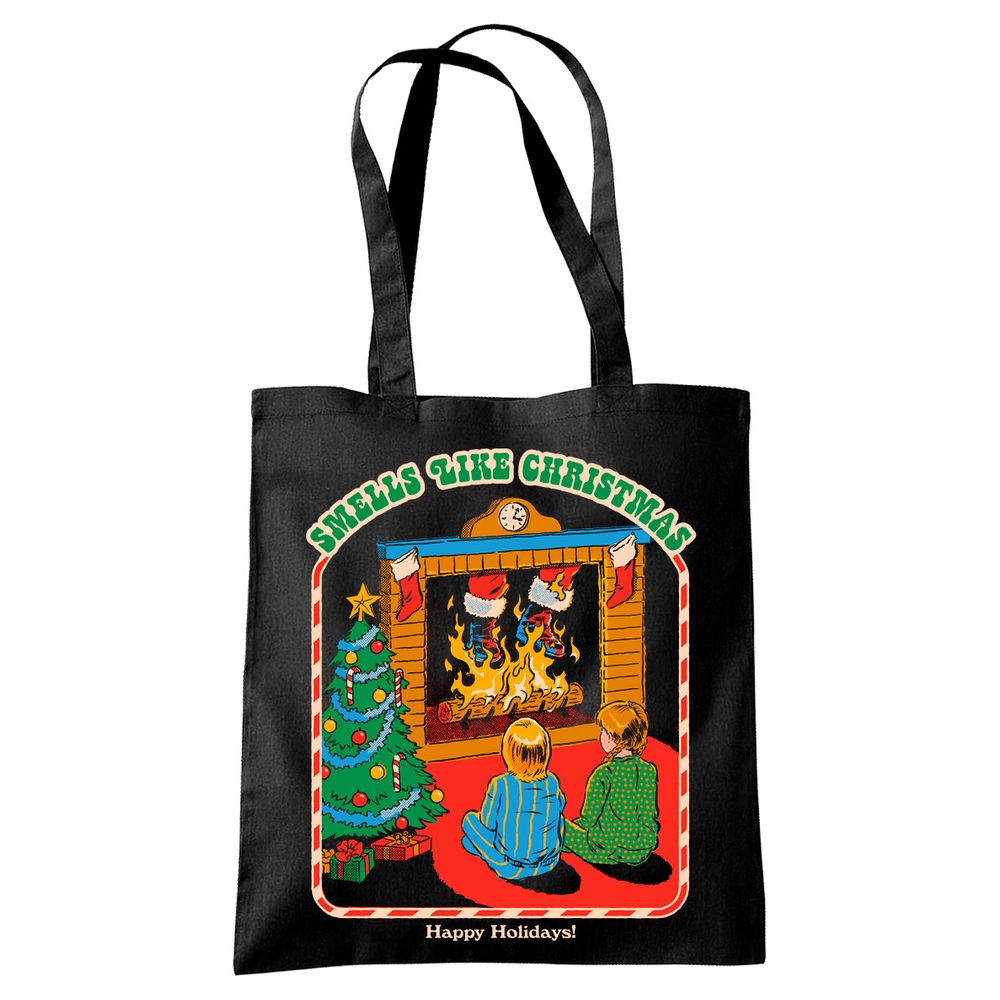 Die Tasche zeigt 2 Kinder, die dabei zusehen, wie Santas Füße im Kamin brutzeln.