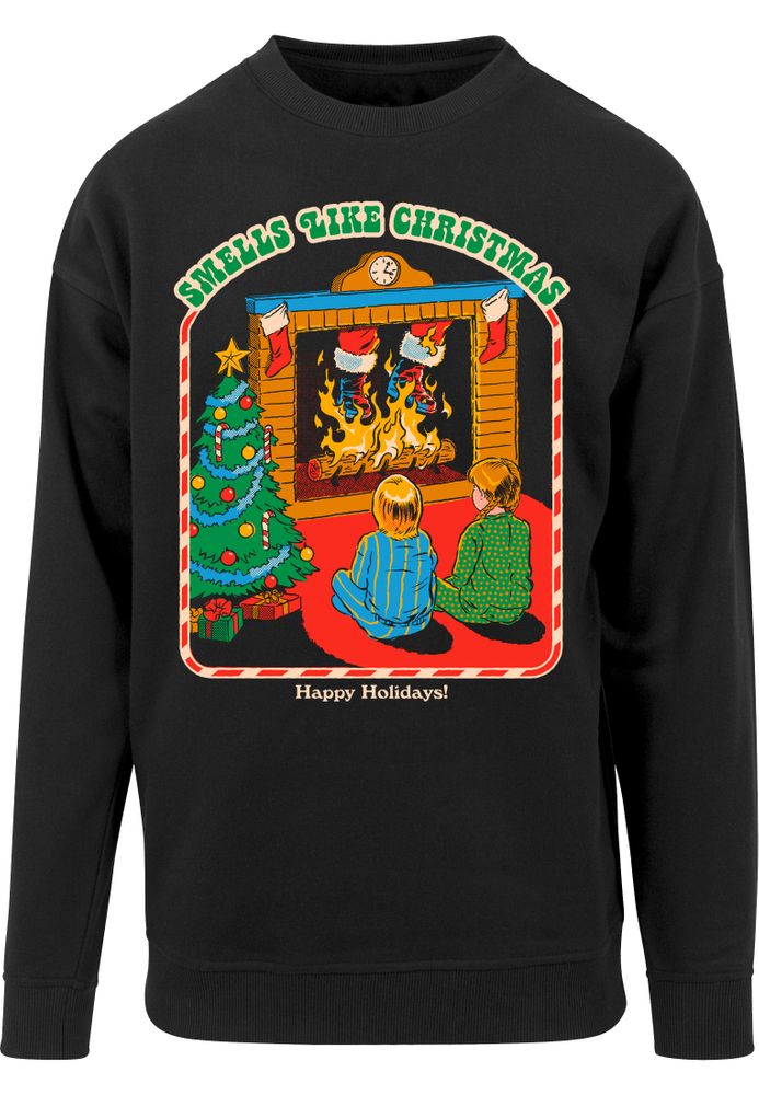Der Sweater zeigt 2 Kinder, die dabei zusehen, wie Santas Füße im Kamin brutzeln.