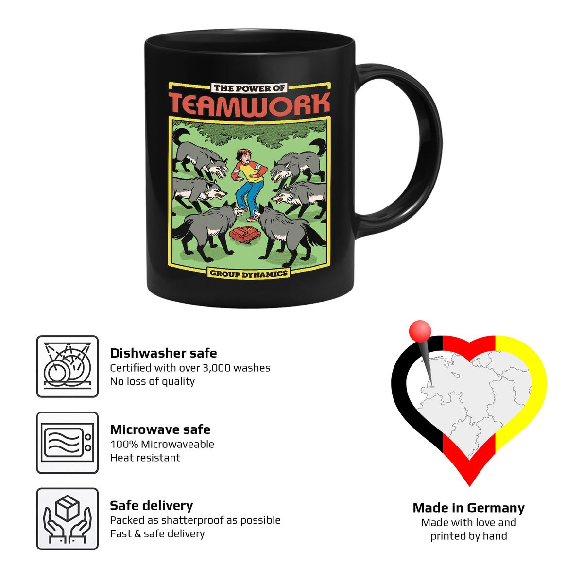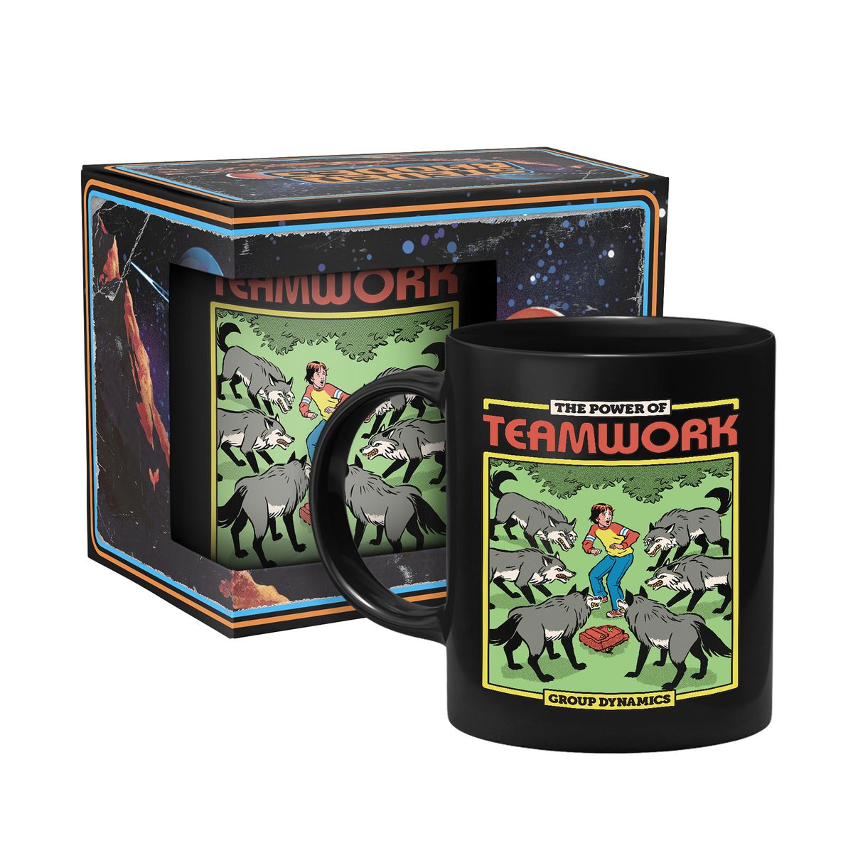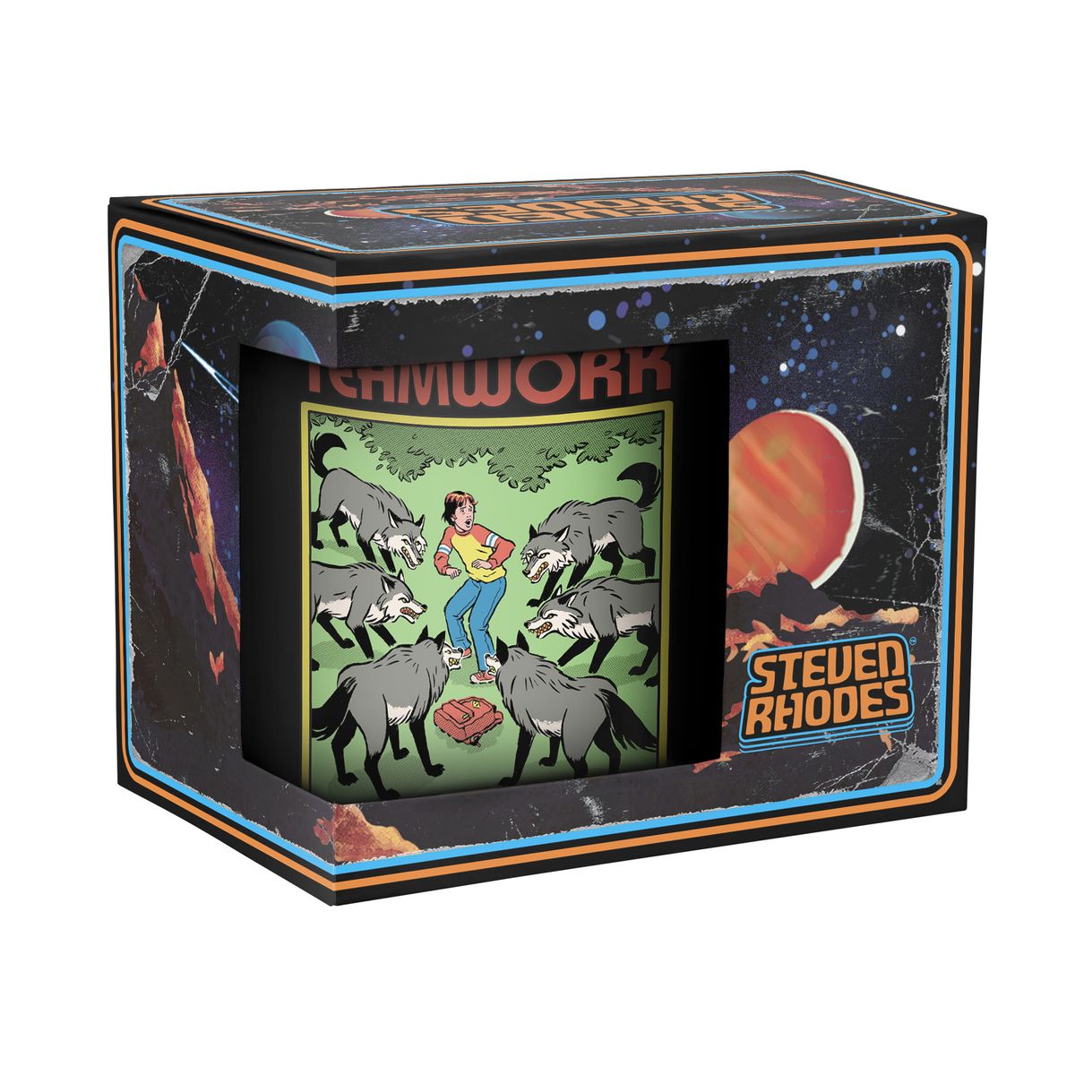 Die Tasse zeigt einen Jungen umgeben von einem Rudel Wölfe.