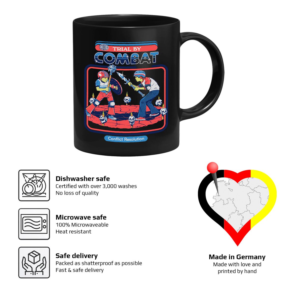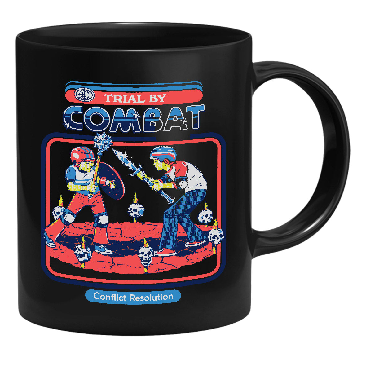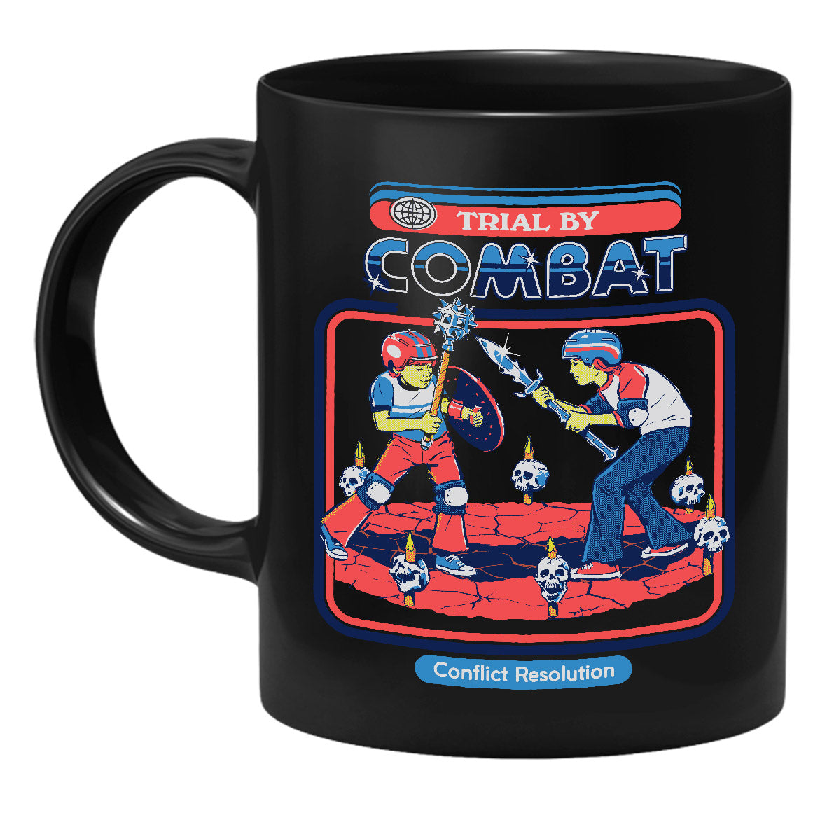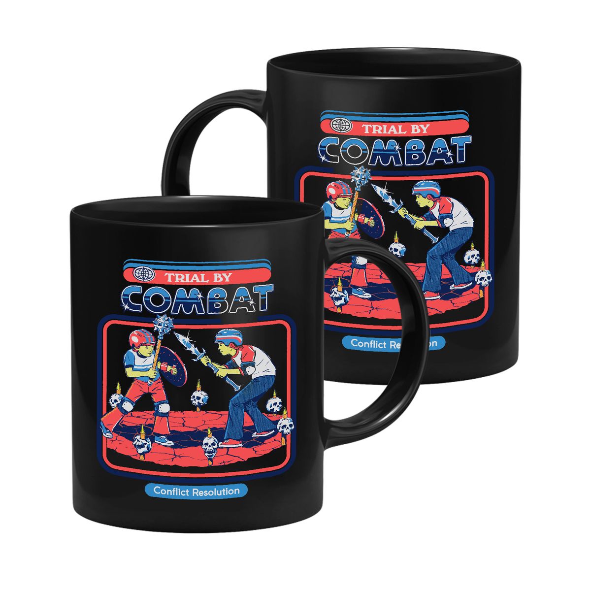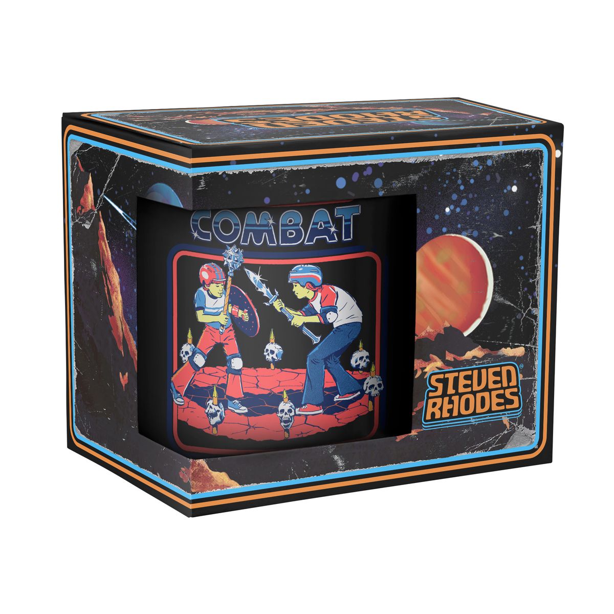 Die Tasse zeigt zwei Jungs, die mit Waffen gegeneinander kämpfen.
