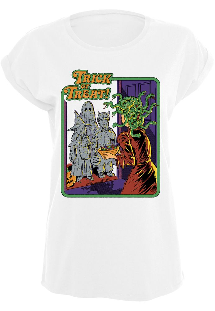 Das T-Shirt zeigt drei Kinder, die beim "Süßes oder Saures" von der Medusa versteinert werden.