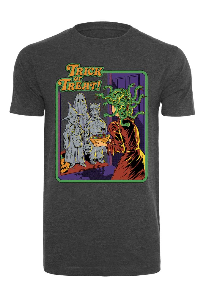 Das T-Shirt zeigt drei Kinder, die beim "Süßes oder Saures" von der Medusa versteinert werden.