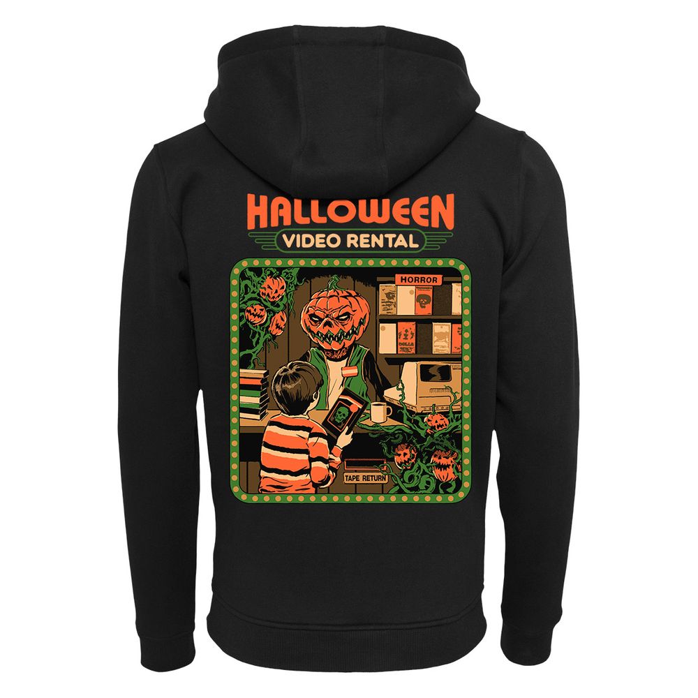 Der Hoodie zeigt ein Kind, das einen Film ausleihen will. Der Verkäufer ist ein Kürbis.