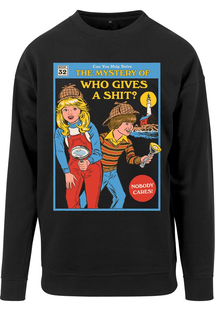 Der Sweater zeigt zwei Kinder, die als Detektive verkleidet sind. Im Hintergrund erkennt man einen Leuchtturm. Oben steht "Can You Help Solve The Mystery Of Who Gives A Shit?".